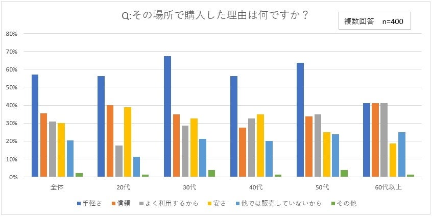 「その場所で購入した理由」では、「手軽だから」が57.0%、「信頼できるから」が35.5%、「よく利用するお店・サイトだから」が31.0%で、使い慣れた信頼感のある通販サイトを利用する人が多いようです。