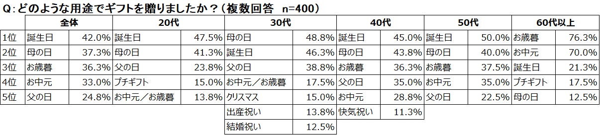 「どのような用途でギフトを贈りましたか」と聞いたところ、多くの世代で「誕生日」が1位でした。年代が上がると「お中元」「お歳暮」の割合が増加し、60代以上では7割以上の方がギフトのタイミングとして重視しています。30代、40代では「出産祝い」「結婚祝い」「快気祝い」など、その年代ならではの心遣いが多くなるようです。