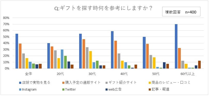 「ギフトを探す時何を参考にしますか」と聞いたところ、全世代で「店舗で実物を見る」が最多で、全体では54.8%となりました。「購入予定の通販サイト」が39.3%で続き、お気に入りの店舗や通販サイトでギフトを探す人が多いようです。また、20代は「各種SNS」を積極的に活用しています。30代は「商品のレビュー・口コミ」、60代以上は「記事・報道」が他の年代に比べて高く、それぞれの年代で普段触れている情報源をギフト選びにも活用する傾向が見えました。