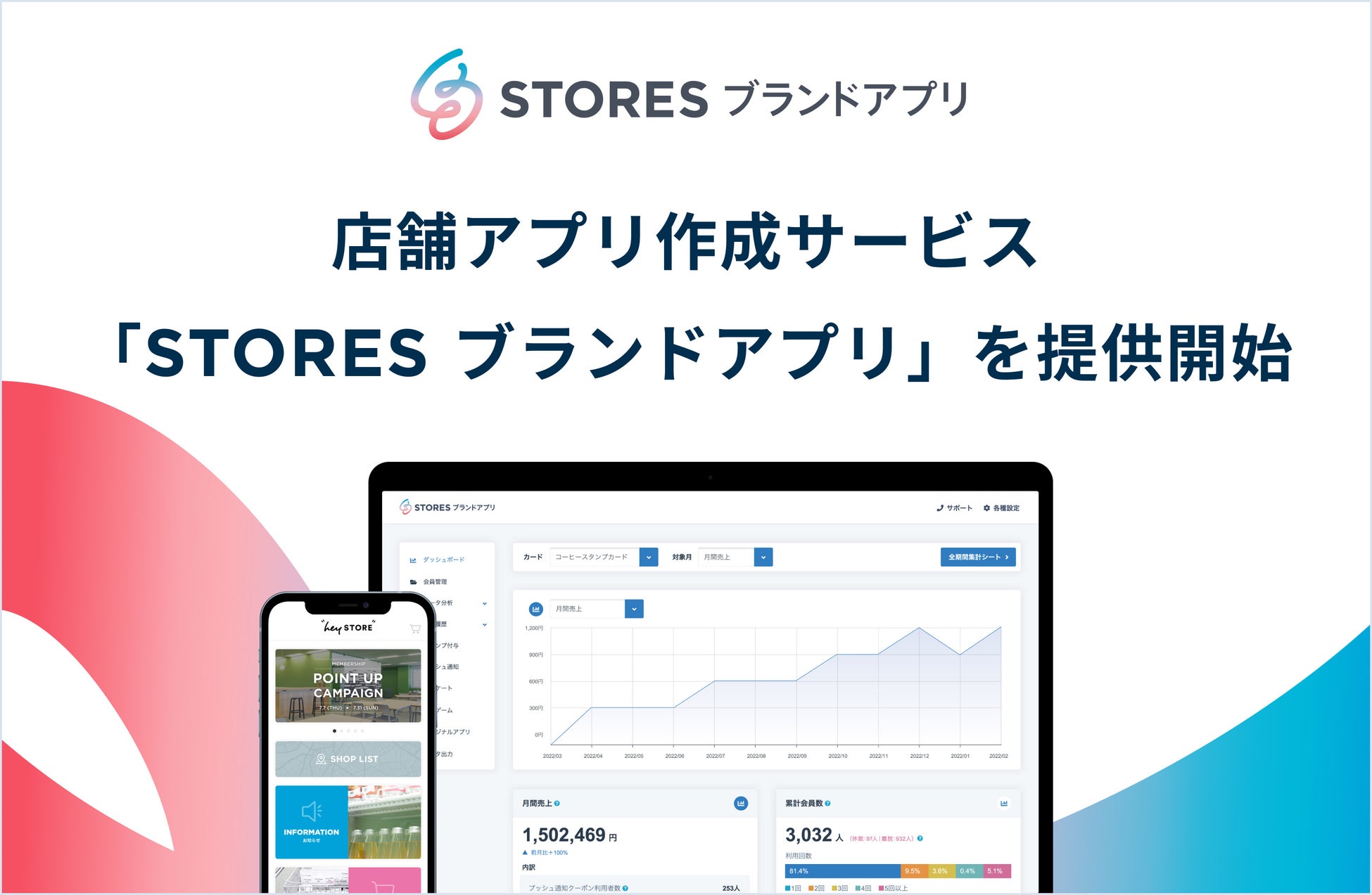 「STORES ブランドアプリ」はお店独自のアプリをかんたんに作成でき、実店舗やネットショップの顧客情報・購買情報をまるっと管理することが可能です。