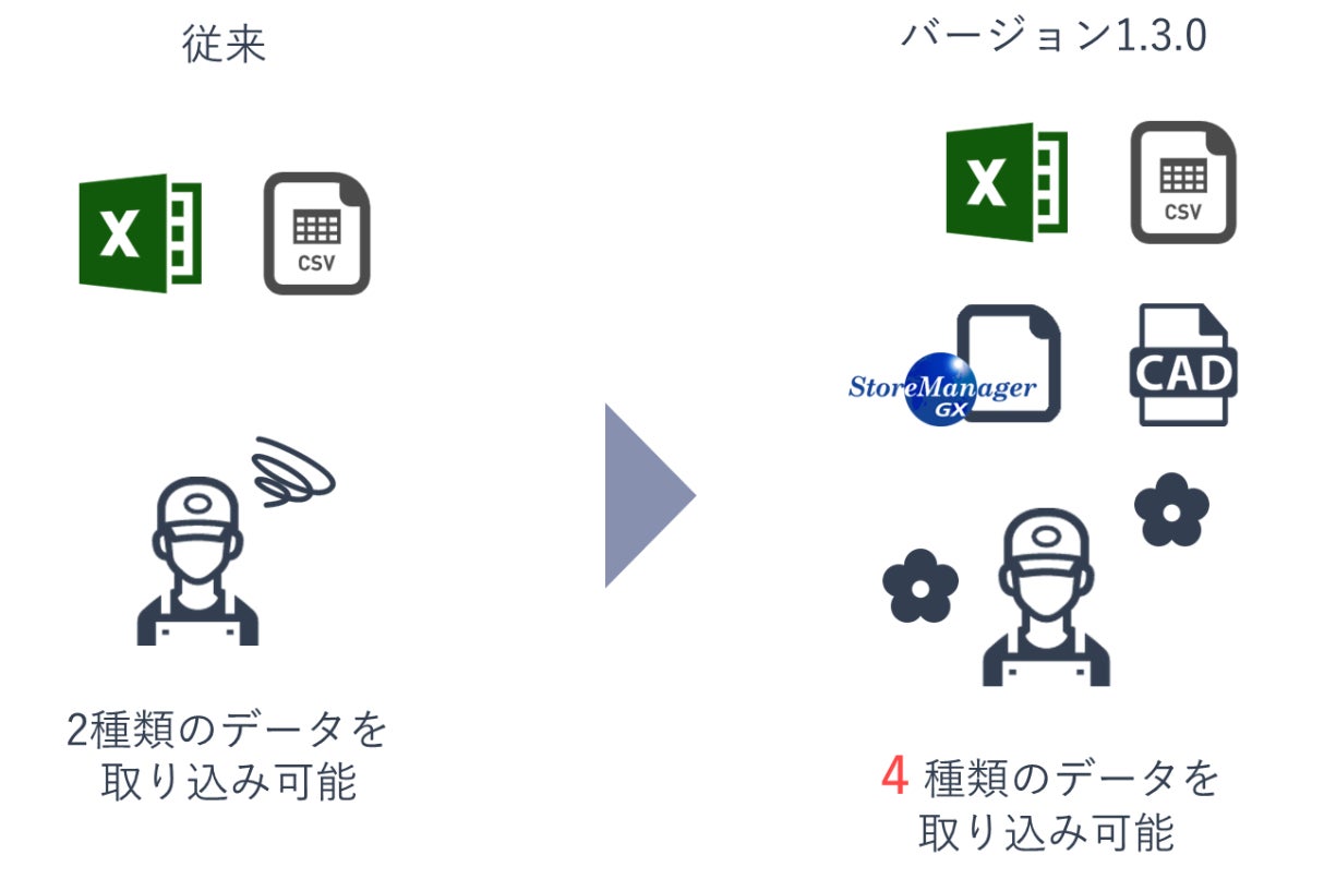 Version1.3では、「棚割りの情報など他システムから直接データを取り込みたい」といった要望を受け、従来のExcelやCSVに限定したデータ取り込みから、新たに日本総合システム株式会社様(本社:東京都文京区 代表取締役社長:伊藤 俊秀)の『StoreManagerGX-R』の棚割データやCADの図面データを変換不要で取り込みが可能となりました。