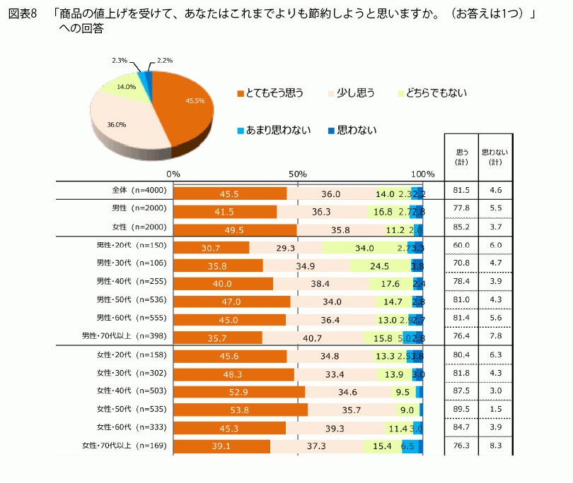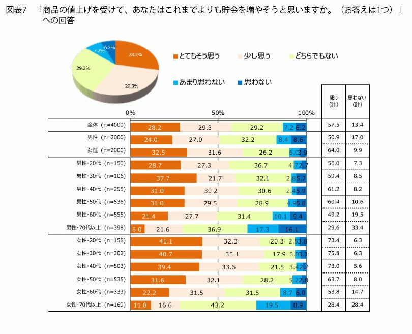 さまざまな商品の値上げを受けて、これまでよりも貯金を増やそうと思うか(図表7)、これまでよりも節約しようと思うか(図表8)を聞きました。