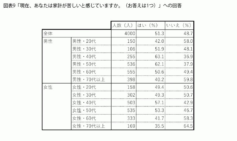 「現在、あなたは家計が苦しいと感じていますか」(図表9)という質問では、「はい」が51.3%、「いいえ」が48.7%でした。ほぼ半数ですが、若干、苦しいと感じている人が上回る結果でした。