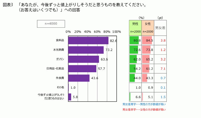 「今後ずっと値上がりしそうだと思うもの」(図表3)も、同順位となっていますが、「外食費」を除いた品目について「値上がりが続きそう」と感じている人が半数を超えています。