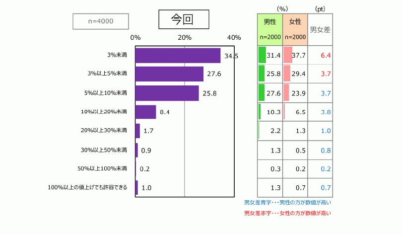 ただ、「3%未満」と回答した人は30.9%から34.5%に上昇し、「3%以上5%未満」が30.8%から27.6%に減少、「5%以上10%未満」も26.1%から25.8%に微減しています。