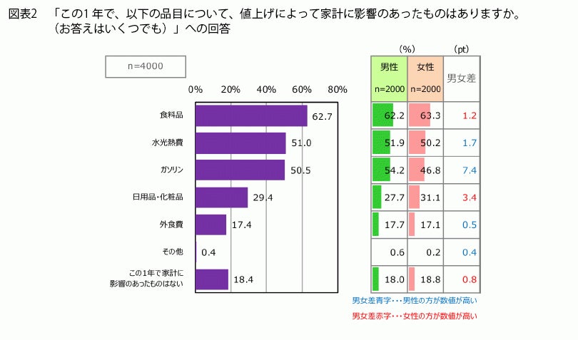 「この1年で値上げによって家計に影響のあったものはありますか」(図表2)と聞いたところ、「食料品」(62.7%)、「水光熱費」(51.0%)、「ガソリン」(50.5%)、「日用品・化粧品」(29.4%)の順になりました。