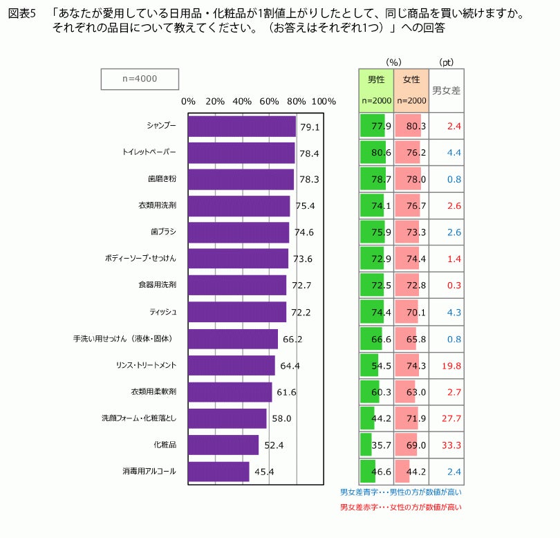 許容できる値上げ幅(図表4)においては、10%以上の値上げを許容できる人は1割強という結果でしたが、愛用しているものをすぐさま切り替えられるかというと、そうではない、という複雑な心理が見えてきます。