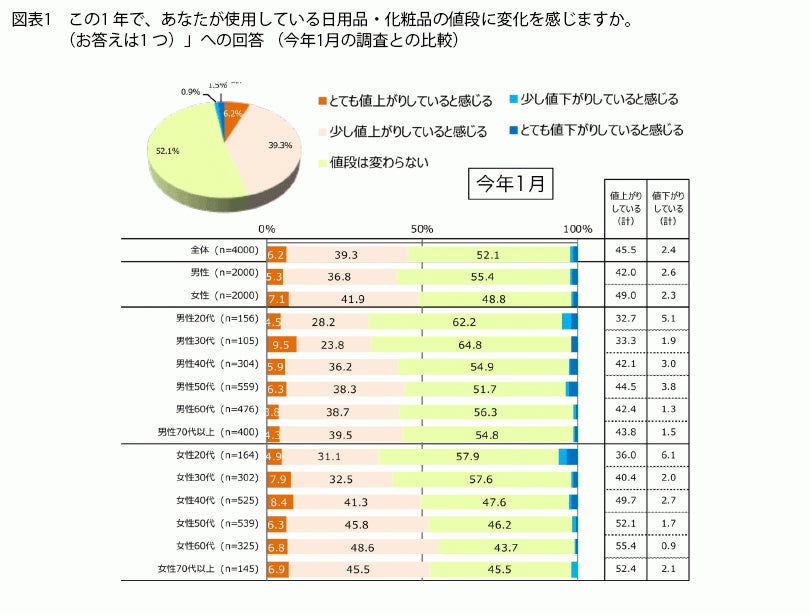 今年1月の調査と同様に「この1年で、あなたが使用している日用品・化粧品の値段に変化を感じますか」と聞いたところ、1月の調査では「とても値上がりしていると感じる」「少し値上がりしていると感じる」の合計はどの年代でも50%を超えていなかったのですが(図表1上)、今回の調査では、男女ともに全年代で50%を超えています(図表1下)。また、「少し値上がりしていると感じる」と回答した割合も高くなっていますが、それ以上に「とても値上がりしていると感じる」と回答した人の割合の伸びが大きいです。