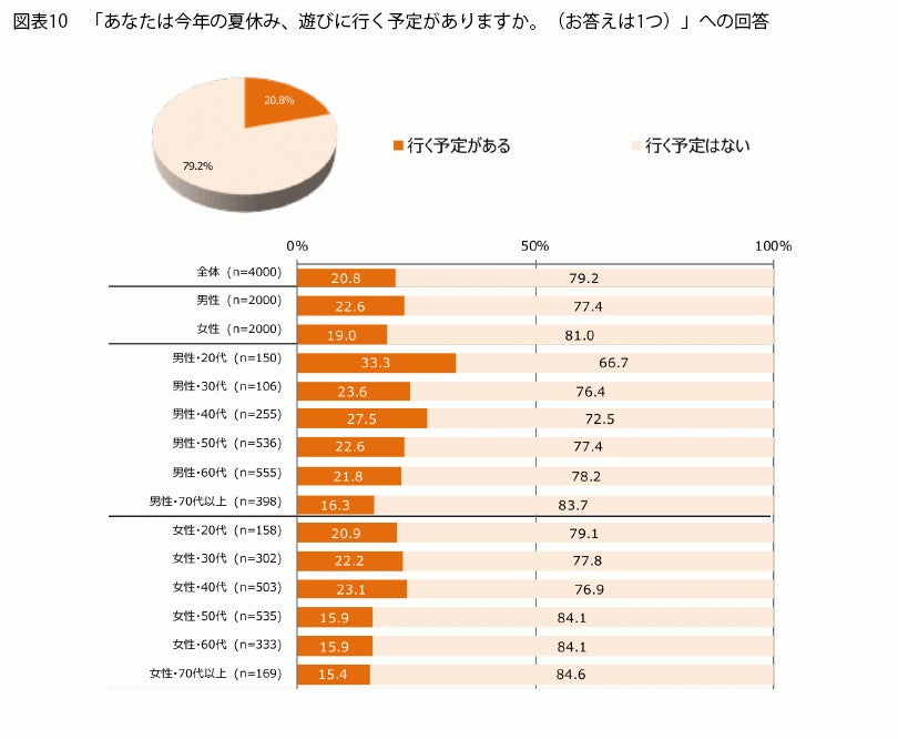 いよいよ夏本番ですが、「あなたは今年の夏休み、遊びに行く予定がありますか」(図表10)と聞いたところ、「行く予定がある」と答えたのは20.8%でした。性年代別に見ると、男女ともに20〜40代は、それ以降の年代より高い割合になっていますが、3割を超えていたのは「男性・20代」(33.3%)のみです。