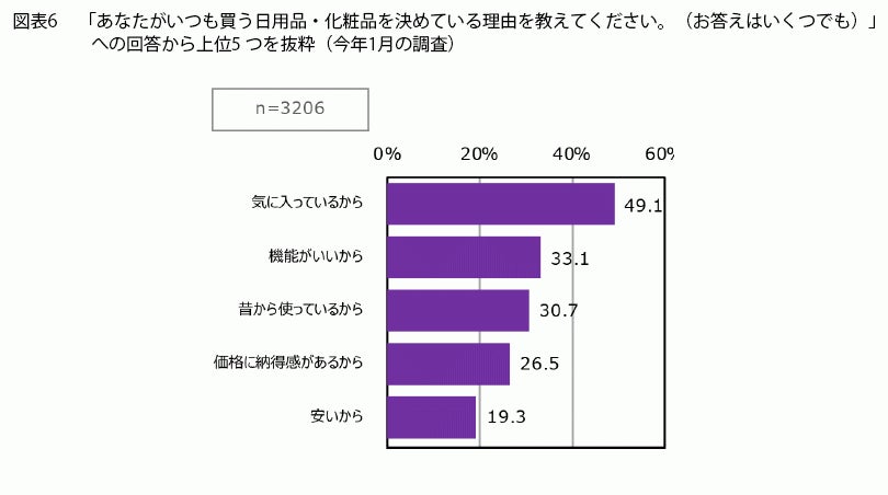 今年1月の調査で、いつも同じブランドを買う日用品・化粧品があるという人を対象に「いつも買う日用品・化粧品を決めている理由を教えてください」(図表6)と聞きました。「価格に納得感があるから」(26.5%)、「安いから」(19.3%)といった値段に関する回答以上に、「気に入っているから」(49.1%)、「機能がいいから」(33.1%)、「昔から使っているから」(30.7%)と回答した割合が高くなっていました。