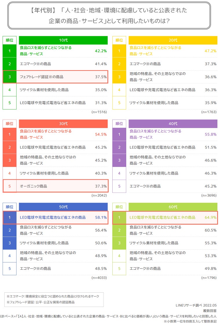 「食品ロスを減らすことにつながる商品・サービス」は、10代~40代で1位となっています。