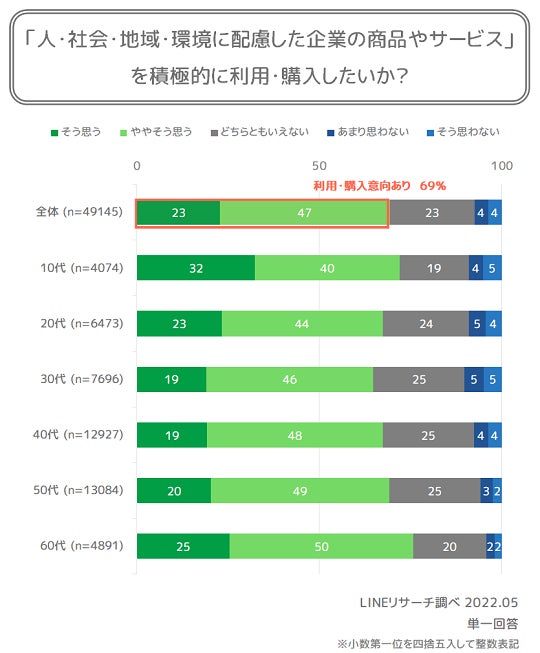 ここからは商品やサービスの利用意向についてみていきます。「人・社会・地域・環境に配慮した企業の商品やサービス」を積極的に利用・購入したいかどうか聞いたところ、全体では「そう思う」「ややそう思う」を合わせた約7割が、利用・購入したいと回答しており、前向きな様子がうかがえます。