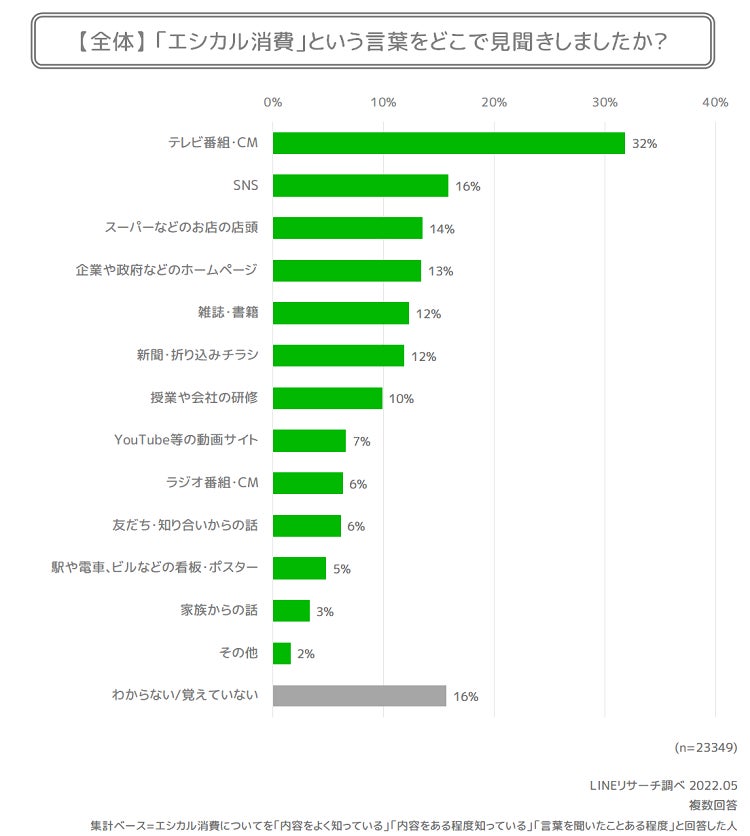 続いて、エシカル消費の認知者※に「エシカル消費」という言葉をどこで見聞きしたか聞いたところ、「テレビ番組・CM」が、もっとも高く3割超となりました。