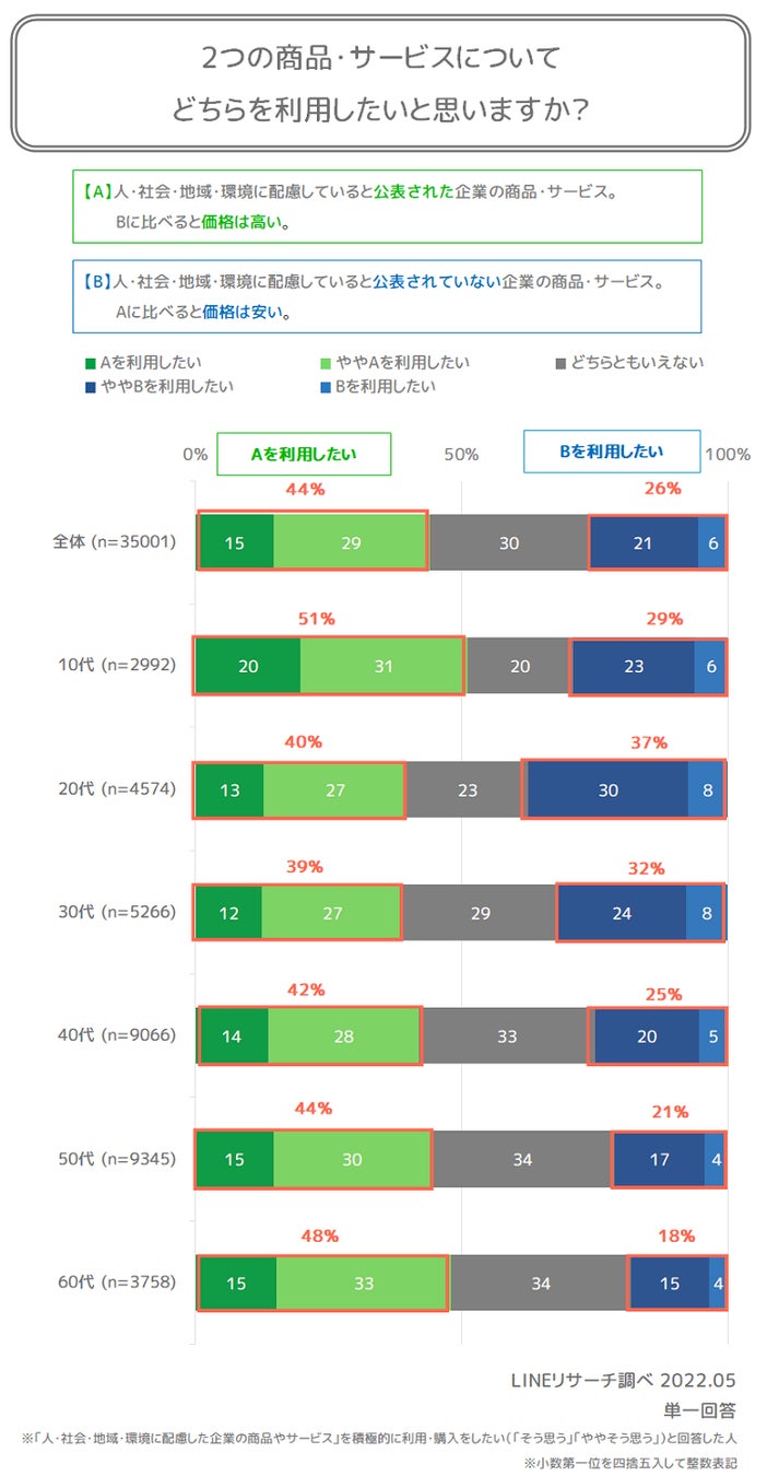 前のグラフでは【利用・購入したい】が各年代7割前後と高かったのに対して、【(価格が高い)Aを利用したい】は44%ということから、商品・サービスを選ぶ際に価格の高さが選ぶ際のネックの1つになっていることがわかります。