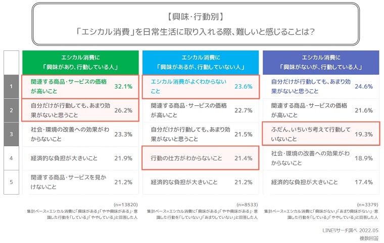 次に、「エシカル消費」を日常に取り入れる際に難しいと感じることについて、「エシカル消費」に興味がある人、意識して行動している人を軸にみていきます。