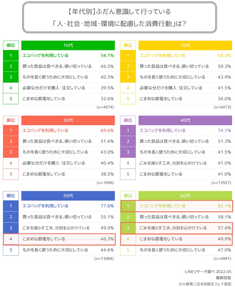 年代別の傾向をみると、全体1位の「エコバッグを利用している」と、2位の「買った食品は食べきる、使い切っている」は、どの年代でも同じ順位となりました。