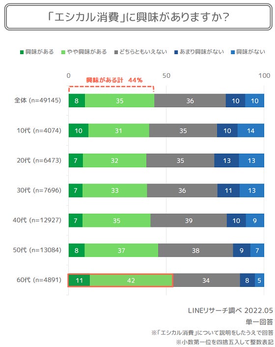 エシカル消費について説明をしたうえで、エシカル消費について興味があるか聞いたところ、全体では「興味がある」と「やや興味がある」を合わせた44%が【興味がある】という結果になりました。