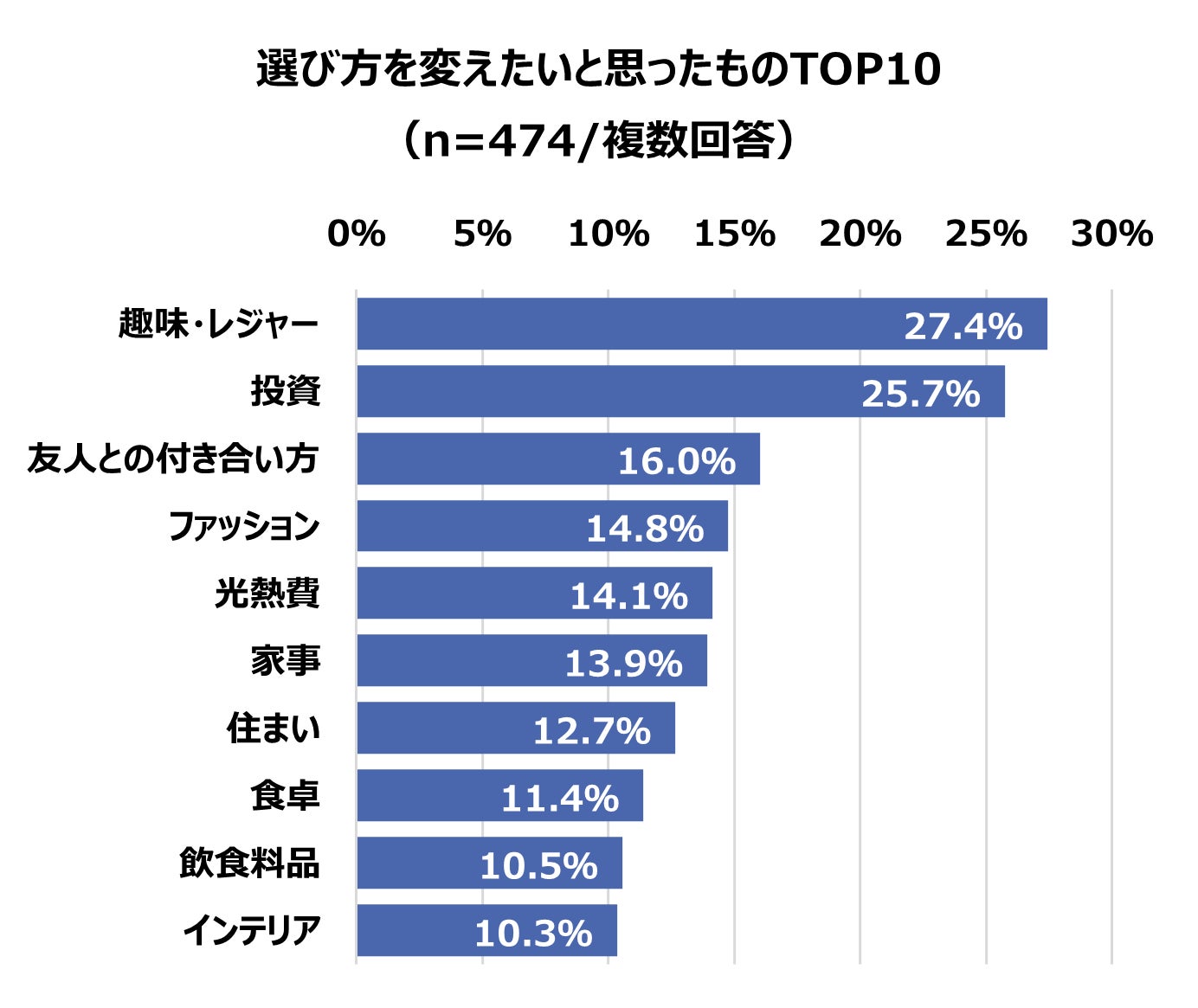 実際に、「変えたい」、「変えた」と回答した方に、そのジャンルをお聞きしました。「変えたい」と思ったものは「趣味・レジャー」が27.4%で最多となりました。次いで「投資」25.7%、「友人との付き合い方」16.0%、「ファッション」14.8%、「光熱費」14.1%と続きます。