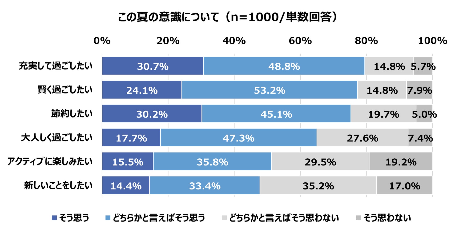 この夏は、「充実して過ごしたい」と思っている方は「そう思う」30.7%、「どちらかと言えばそう思う」48.8%と計79.5%となり、各項目の中で最も高くなりました。また、「節約したい」という方が計75.3%いる一方で、「アクティブに楽しみたい」計51.3%、「新しいことをしたい」計47.8%と、今年の夏は消費や行動を変える「内から外」への動きが見て取れる結果となりました。