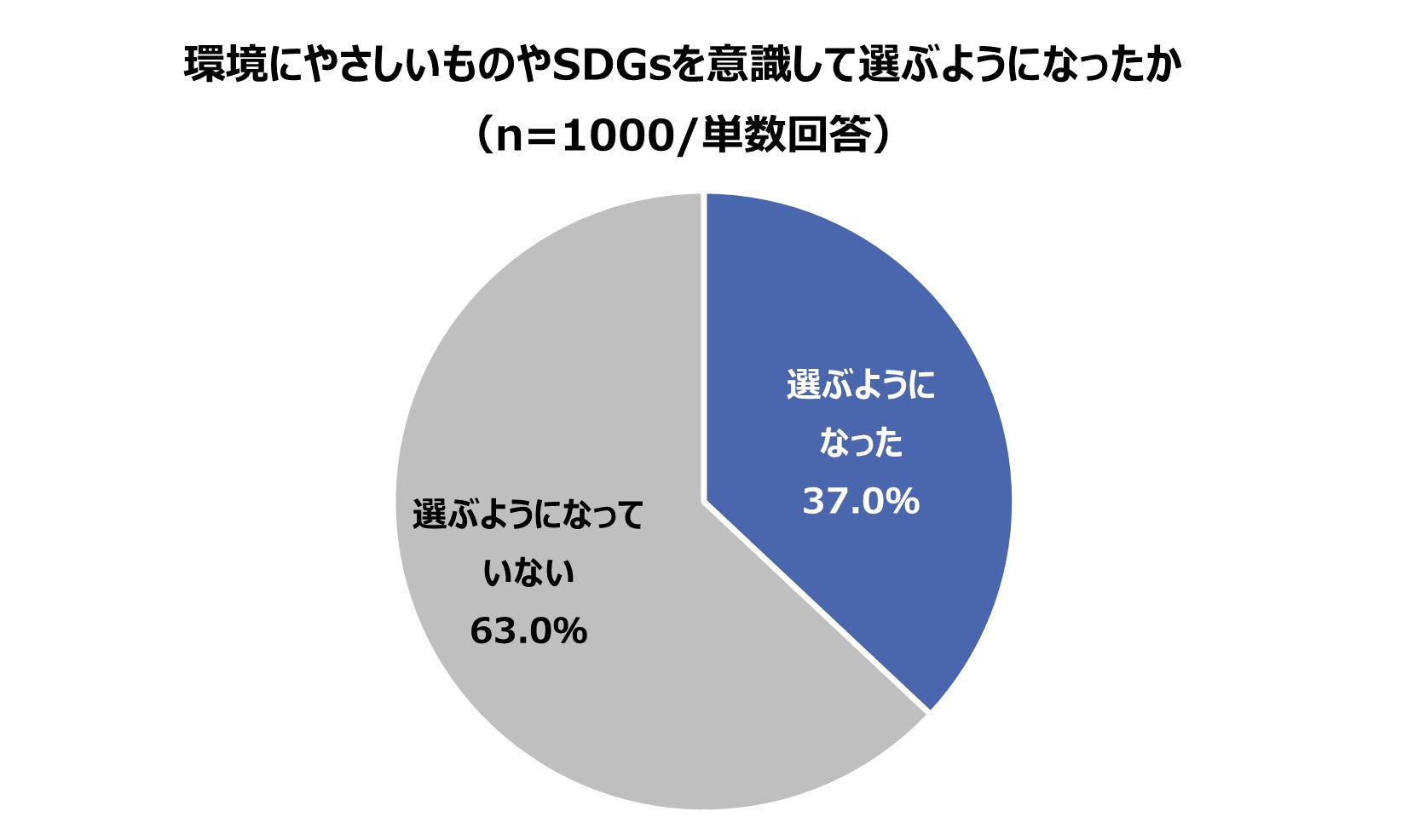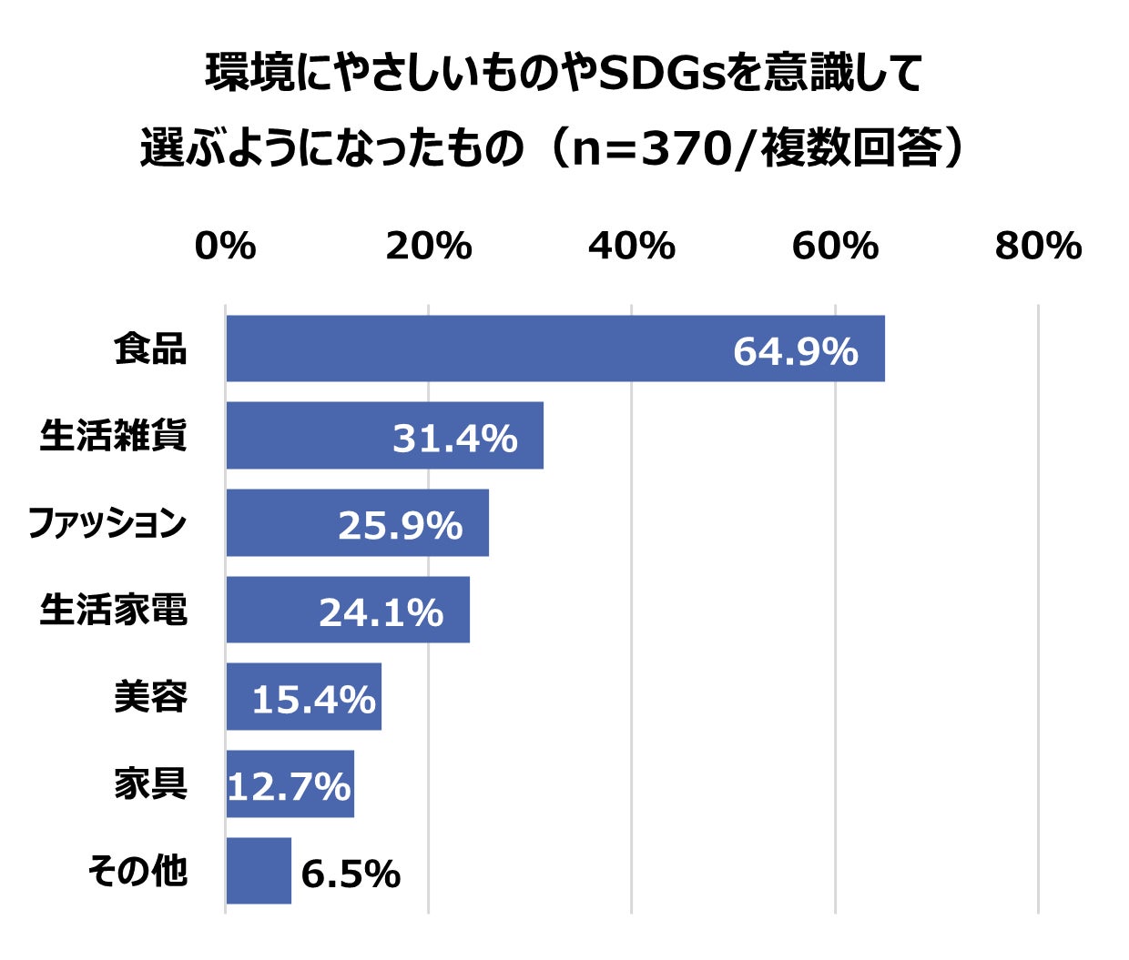今後どのようなものを消費者は選んでいくのか、「環境」「SDGs」に焦点を絞り詳細を調べたところ、37.0%と約3人に1人が環境にやさしいものやSDGsを意識して選ぶようになったと回答しました。ジャンルでは「食品」が最も多く64.9%、次いで「生活雑貨」31.4%、「ファッション」25.9%と続き、エシカル消費への興味関心の高まりにより、一番身近で必要不可欠な「食品」をはじめ、乗り換え消費が進んで行くことが予想されます。