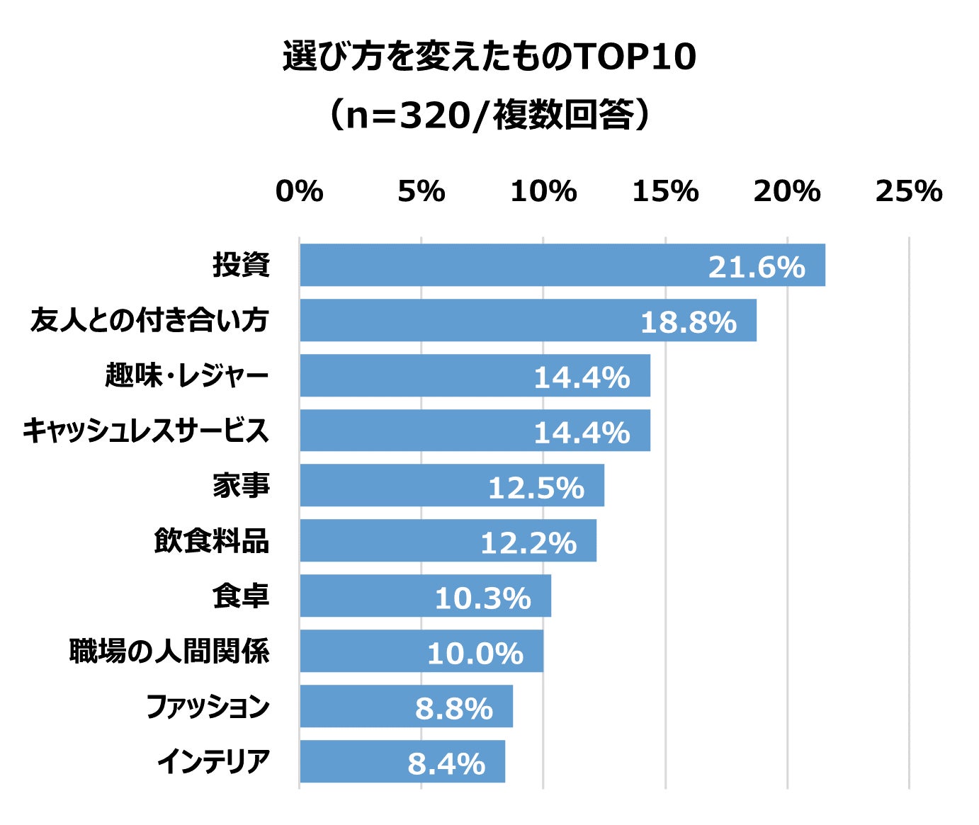 実際に「変えた」ものは「投資」21.6%、「友人との付き合い方」18.8%、「趣味・レジャー」14.4%と続きます。政府が「貯蓄から投資」への政策を推し進めていることや、新型コロナウイルス感染症の影響がうかがえる内容となりました。