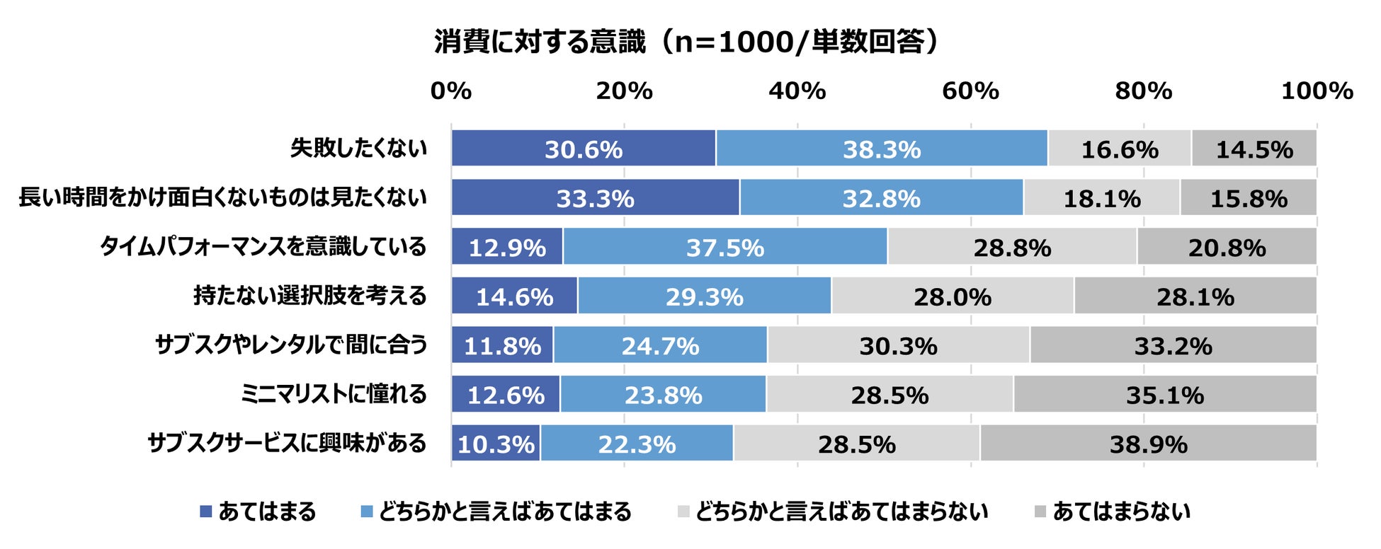 消費活動全般についてお聞きすると、やはり「失敗したくない」という意識は強く、計68.9%が「あてはまる」と回答しました。「タイパ」(タイムパフォーマンス)、「持たない選択肢」に関しても約半数以上が該当し、堅実に、そして後悔しない商品選びを意識している傾向が見られました。