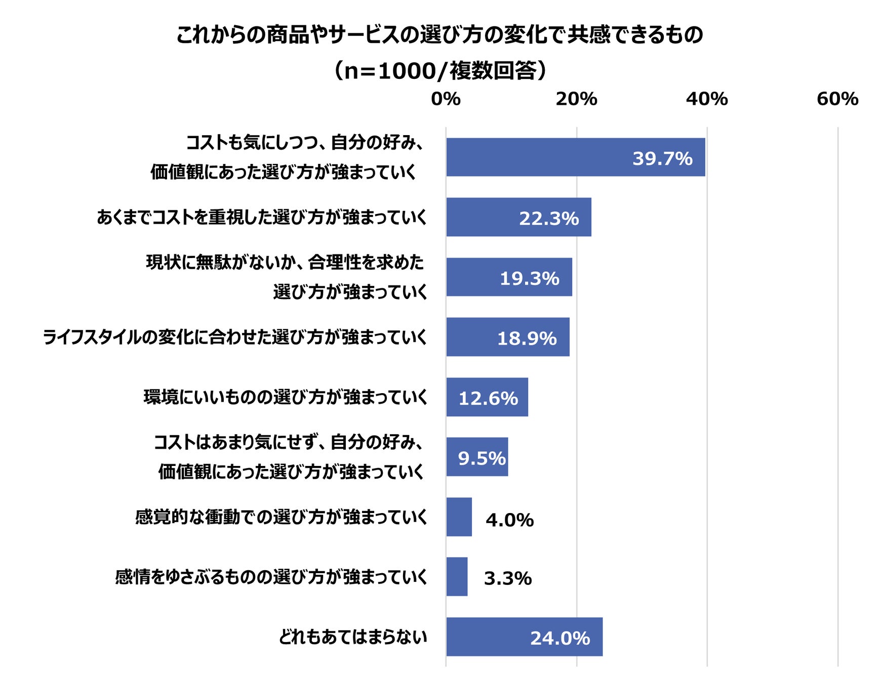 商品やサービスの選び方は新型コロナウイルス感染症や物価上昇、SDGsなどの影響を受け、様々に変化しているようです。約4割の方が「コストも気にしつつ、自分の好み、価値観にあった選び方が強まっていく」と考えていることがわかりました。