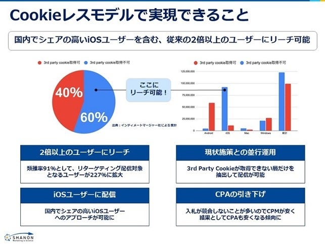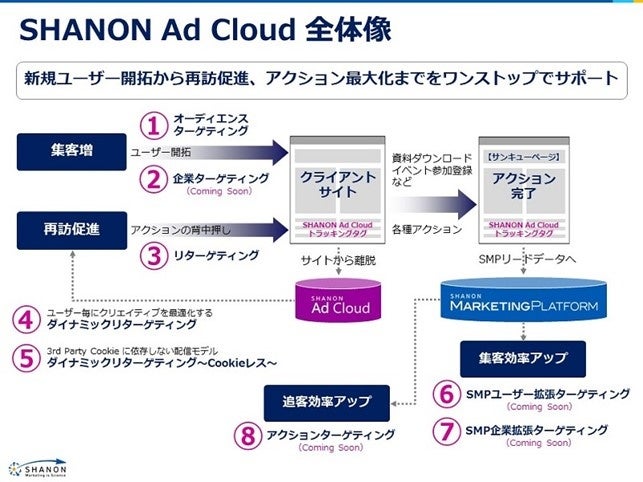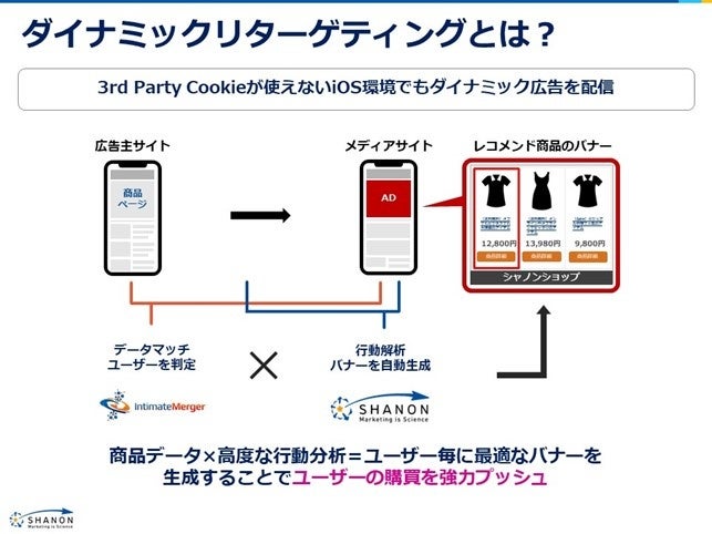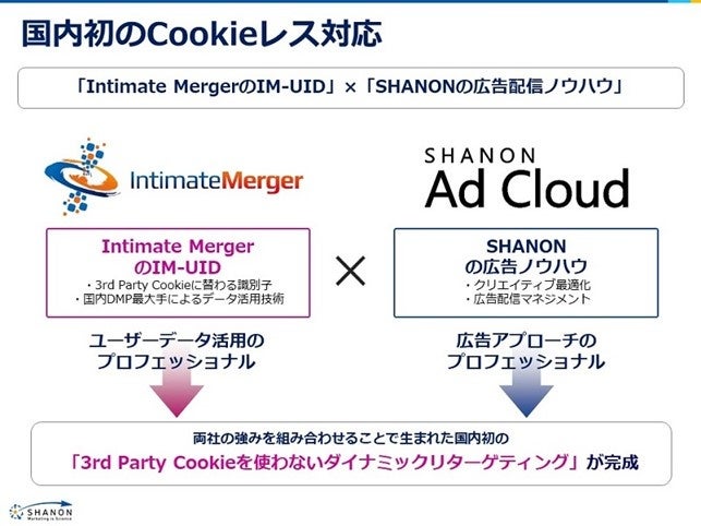 株式会社シャノン(代表取締役社⻑:中村 健⼀郎、証券コード:3976、以下シャノン)と株式会社インティメート・マージャー(代表取締役社長:簗島 亮次、証券コード:7072、以下インティメート・マージャー)は、ワンストップマーケティングを目指して、MA(マーケティングオートメーション)と連携可能な広告プラットフォーム「SHANON アドクラウド」に、国内初のサードパーティークッキーに依存しない「ポストクッキーダイナミックリターゲティング広告」を追加することを発表いたします。