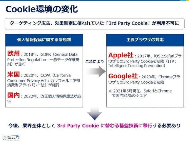 iOS14以降、サードパーティークッキーの取得が規制され、それに依存していた多くのダイナミックリターゲティング広告を利用することができなくなりました。特に日本においてはモバイル環境においてiOSの利用率が高く(*1)、EC、求人、旅行、不動産などサイトの閲覧状況に応じた広告を扱う広告主への大きな打撃となりました。2023年には、GoogleのChromeブラウザにおいてもサードパーティークッキーが廃止されます。