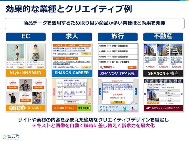 従来から提供している、サードパーティークッキーを利用したダイナミックリターゲティング領域で1,000案件以上の運用実績をもつシャノンだからこそ精度の高い配信エンジンが提供できます。サイトや商材の特徴に応じてクリエイティブを検証することでさらなる効果改善を図っています。