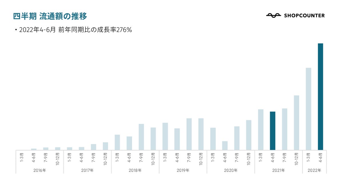 株式会社COUNTER WORKS(東京都目黒区、代表取締役CEO:三瓶直樹)が提供する「SHOPCOUNTER(https://shopcounter.jp)」について、2022年4-6月の流通額が前年同期比276%となり、プラットフォームにおける過去最高値を更新いたしました。