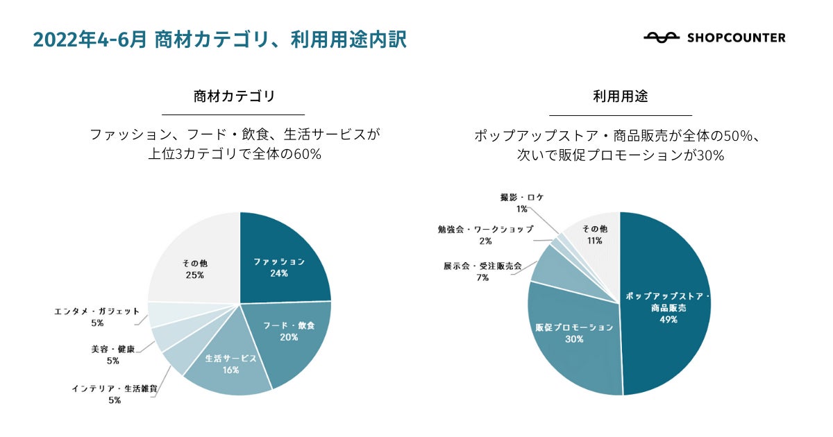 ご利用企業様の業種は多岐に渡り、中でも「ファッション」「フード・飲料」「生活サービス」が多く、3カテゴリ合計で全体の60%を占めます。また利用用途は「ポップアップストア・商品販売」が約50%、次いで「販促プロモーション」が30%となっており、この2用途合計で80%を占めております。