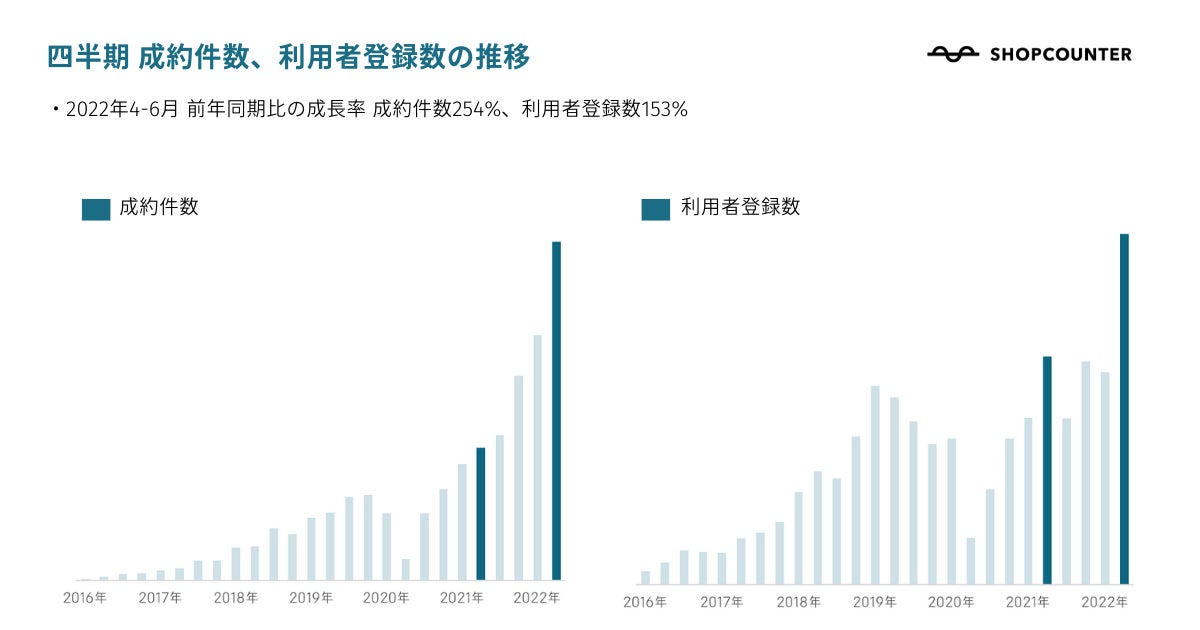 併せて、流通額以外の重要KPI指標として、プラットフォームを通じて出店場所への予約と決済完了値を示す「成約件数」は前年同期比で254%、「SHOPCOUNTER」の利用者登録数は前年同期比で153%と、大きく増加しております。