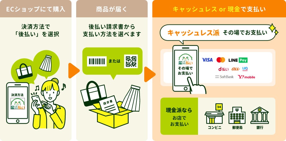 「届いてから払い」は、商品やサービスを確認してからお支払いができる後払いの「安心感」に加え、自由なお支払いスタイルを実現できる「利便性」も提供可能なサービスです。