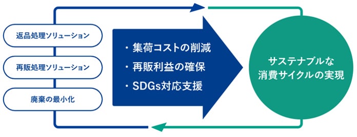本サービスは小売業者ごと、もしくは販売サイトや店舗ごとのご要望をお聞きしてオーダーメイドの返品処理作業を行う形をとっておりますが、特に御要望が無い限りは廃棄処分を極力少なくする手段を講じて行きたいと考えております。その為、商品を素材へ戻して再生する事業者や発展途上国への寄付などを行っている事業者とも提携を進めており、販売事業者様のサスティナブルな取り組みに貢献して参りたいと考えております。