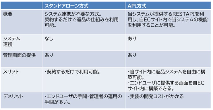 小売事業者とAPI連携によってスムーズに返品可能なタイプと、直ぐにでもサービスを受けられたい小売事業者向けのスタンドアローンタイプをご用意しております。