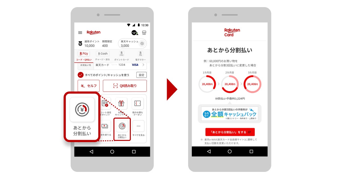 「楽天ペイ」アプリはこれまで、利用シーンを拡げるUIアップデートを行ってきました。今回利用可能になる「楽天カード」の「あとから分割払い」のサービスは、ショッピング1回払いの利用分をオンラインでいつでも分割払いに変更できるサービスです。分割払いに変更したい利用分を選択して3・5・6・10・12・15・18・20・24・30・36回のなかから、ご希望の支払い回数がご指定いただけます(※)。今回のUI強化により、「楽天ペイ」アプリから「楽天カード」の「あとから分割払い」サービスページに遷移して「あとから分割払い」を利用できるようになり、さらに便利なアプリとなります。