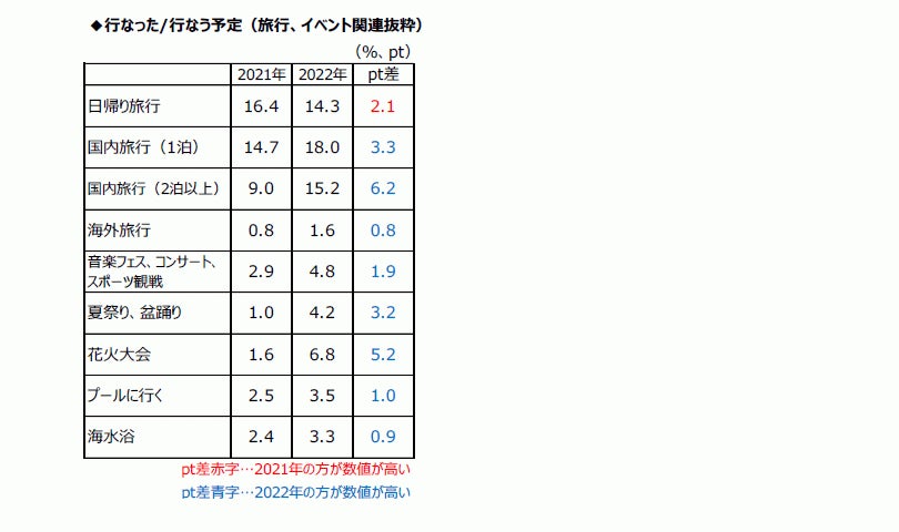 これが今年は様相が変わります。“行なう予定”比率をみると、「国内旅行」は「1泊」18.0%、「2泊以上」15.2%と昨年より各3.3・6.2ポイント上昇、“見合わせる予定”の比率も1桁台に低下しています。一方で「日帰り」は昨年より2.1ポイント低下しており、宿泊を伴う旅行にシフトしていることがわかります。また「友人、知人との外食・飲み会」も、昨年は7.7%とランク外だったのが10.8%に向上し、家族以外とのアクティビティも再開傾向に。さらにイベント関連でも、昨年比で「花火大会」5.2ポイント、「夏祭り、盆踊り」3.2ポイント、「音楽フェス、コンサート、スポーツ観戦」1.9ポイントそれぞれ昨年を上回り、有観客化の進展に伴って参加意欲が高まっているようです。
