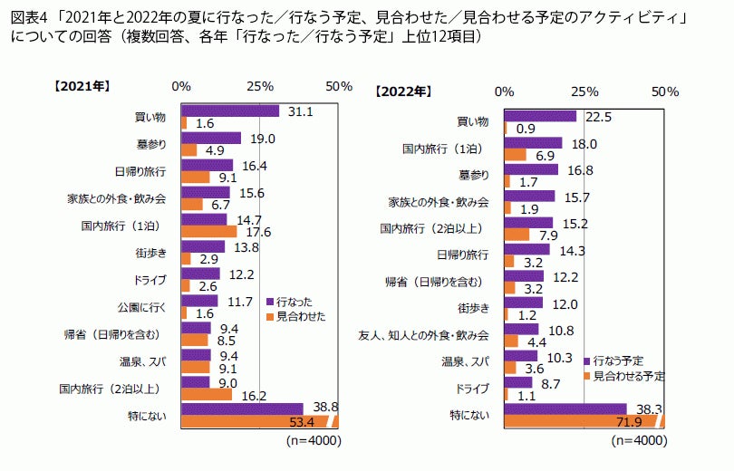 さらに、昨年(2021年)と今年(2022年)の夏について、行なった/行なう予定、見合わせた/見合わせる予定のアクティビティを聞いてみました(図表4)。昨年行なった項目の上位をみると、近場(「買い物」「街歩き」「公園に行く」)、短時間(「日帰り旅行」)、他者との接触を避ける(「家族との外食・飲み会」「墓参り」「ドライブ」)、の傾向が見て取れます。「国内旅行」では「1泊」「2泊以上」は“見合わせた”が“行なった”を上回っており、宿泊を伴う旅行には慎重な姿勢だったことがわかります。さらに、高齢者と接触する可能性がある「帰省(日帰りを含む)」や他者との接触の可能性がある「温泉、スパ」では両者が拮抗していました。