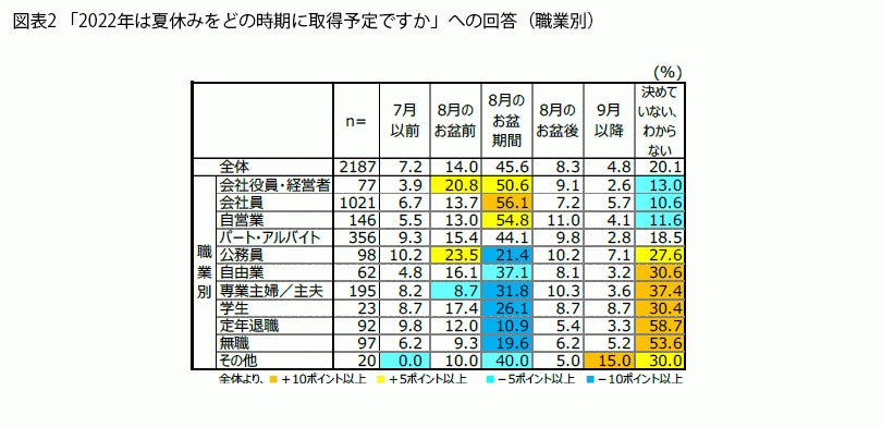 夏休みというと、“お盆の帰省ラッシュ”を思い浮かべますが、「7~9月の間に〇日間」などのように個人の裁量で休みを取る職場も増えています。そこで、今年はどの時期に夏休みを取得するかを聞いてみたところ(図表2)、最多だったのは定番の「8月のお盆期間」45.6%。“会社役員・経営者” “会社員” “自営業”で過半数にのぼることから、お盆期間に夏休みを固定している職場がまだ多いということでしょうか。これに「8月のお盆前」14.0%、「8月のお盆後」8.3%が続き、約7割の人は8月中に夏休みを取得する予定のようです。近年注目されている「シルバーウィーク」(今年は9月17~25日)を含む「9月以降」は4.8%と、「7月以前」7.2%を下回る結果に。子どもや家族の予定と合わせようとすると、9月に休みは取りずらい面もありそうですね。取得時期を「決めていない、わからない」人も2割に。“会社役員・経営者” “会社員” “自営業”では1割程度にとどまる一方で、“公務員”は27.6%と高いのは興味深いところです。
