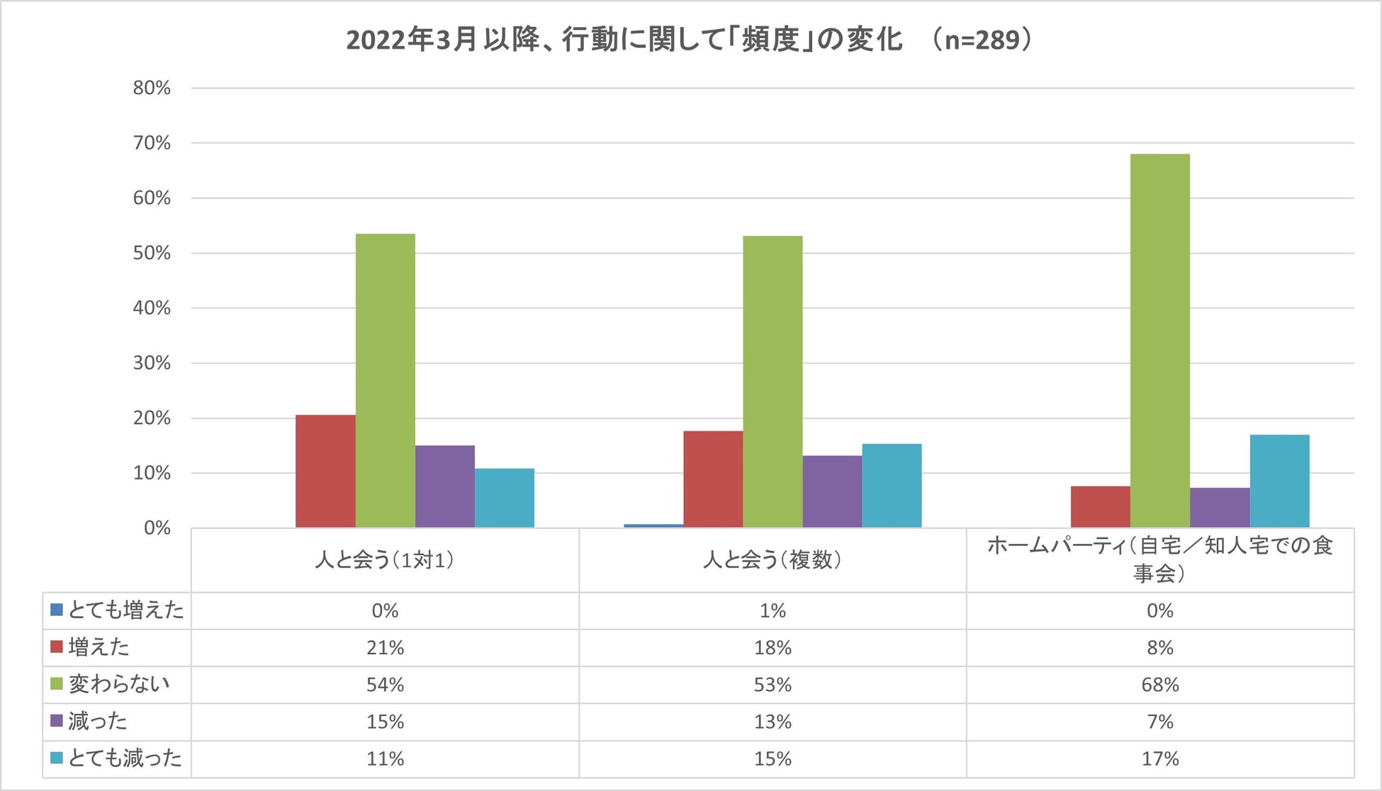 行動制限が緩和されてからの変化について、対面交流の機会が約2割ほど増え、ホームパーティーも約1割ほど増えている傾向です。