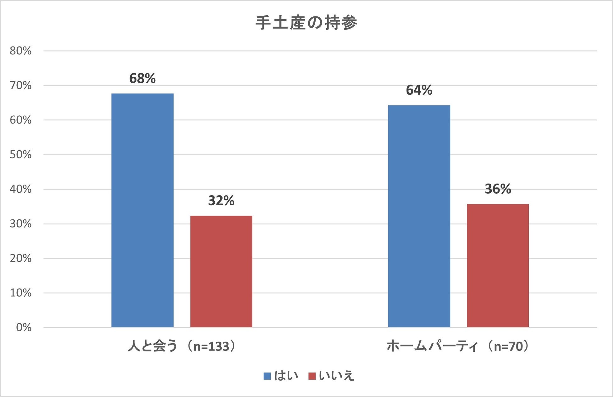 対面交流やホームパーティーの機会が増えるなか、約7割が手土産を持参すると回答しています。久しぶりの対面時に親睦や感謝の気持ちとして手土産を持参する機会も多いのではないでしょうか。