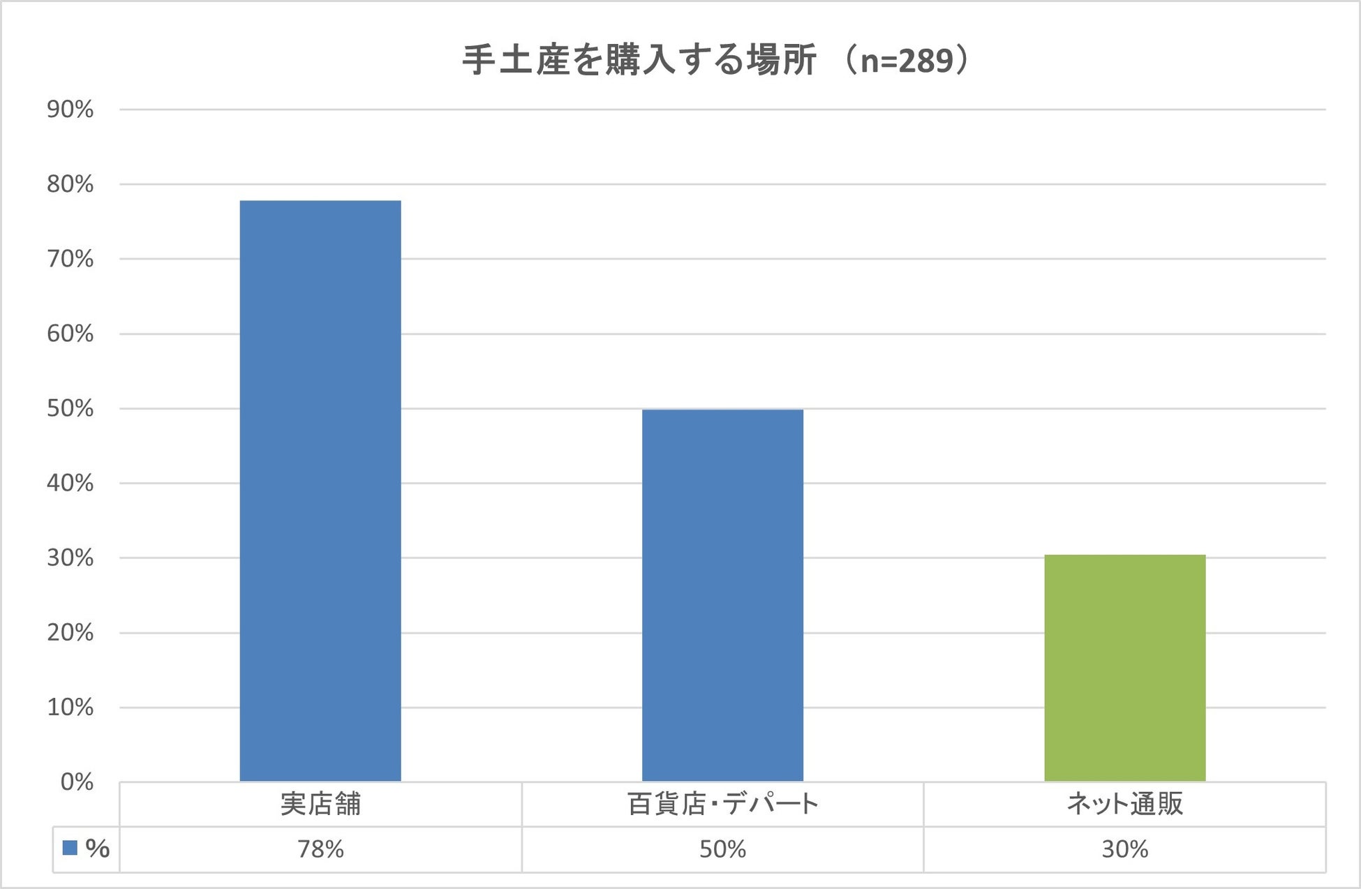 ・手土産の購入場所:実店舗約8割、ネット通販3割