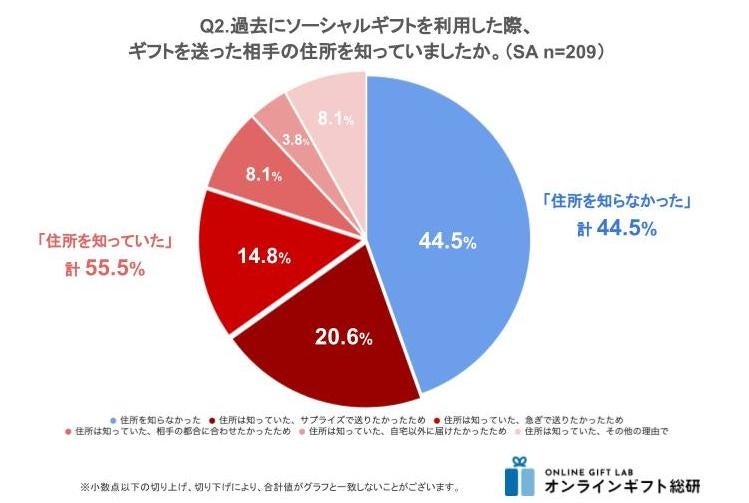 ソーシャルギフト利用経験者に対して、過去にソーシャルギフトを利用した際にギフトを送った相手の住所を知っていたかを聞いたところ、「住所を知らなかった」44.5%に対して、「住所を知っていた」と回答した人が計55.5%と上回った結果となりました。