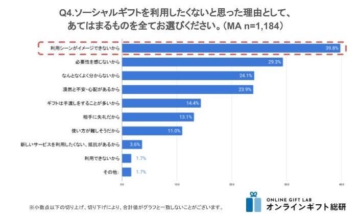 そんな非利用意向者にソーシャルギフトを利用したくないと思った理由を聞いたところ「利用シーンがイメージできないから」が39.8%と圧倒的に多く、世代別に見ても全世代で最も多い理由となりました。続いて「必要性を感じないから」(29.3%)、「なんとなくよく分からないから」(24.1%)、「漠然と不安・心配があるから」(23.9%)を20%以上が選択する理由となりました。