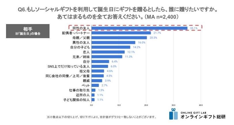次に最多シーンである「誕生日」に焦点を当て、贈りたい相手を聞いてみると「同性の友人」が35.1%で最も多く、「配偶者・パートナー」(21.7%)、「母親/父親」(20.3%)も20%を超える結果となりました。