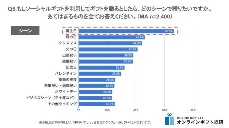 まず利用シーンを質問すると、「誕生日」が66.5%と最も高い結果となりました。最も低かったのは「ビジネスシーン(手土産など)」で23.3%でした。