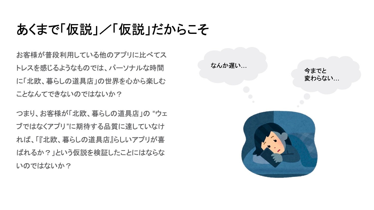 ただし、今回の開発は「北欧、暮らしの道具店」らしいアプリがあれば、新しい場所としてお客様に喜んでもらえるのではないか? というあくまでも「仮説の検証」としての開始でした。そのため、社内の体制や業務を大きく変えるような負荷を避けて、開発を進めることが条件となりました。