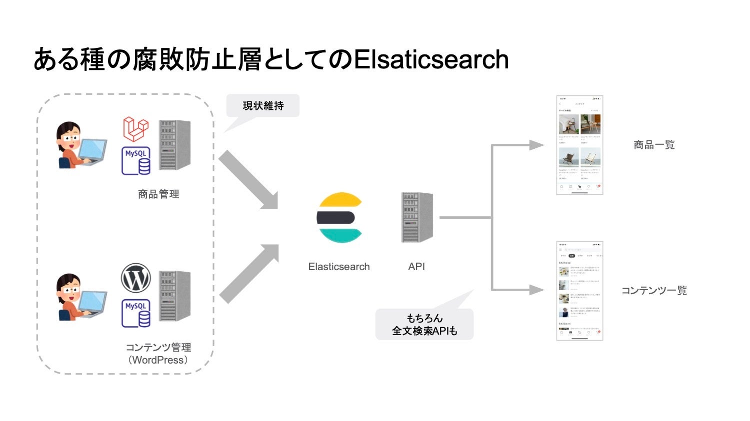 そこで、全文検索機能で使う想定だったElasticsearchを利用し、そこに全てのデータを集約することで、APIのデータソースとして利用することにしました。