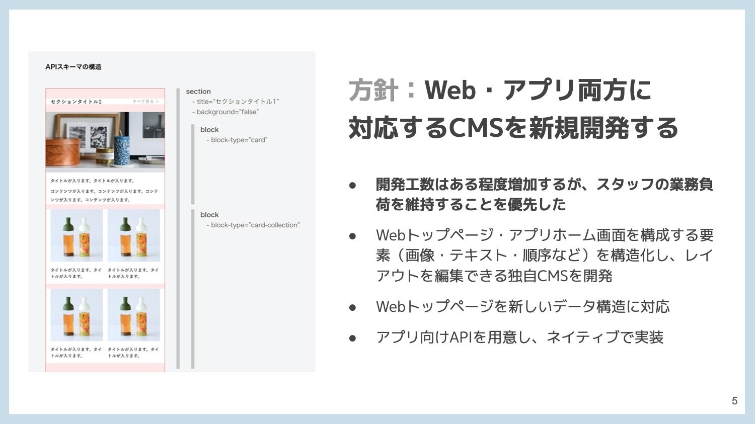 そこで、開発工数は増えますが、業務負担の維持を優先するために、Webとアプリ、両方に対応する新しいCMSを開発しました。